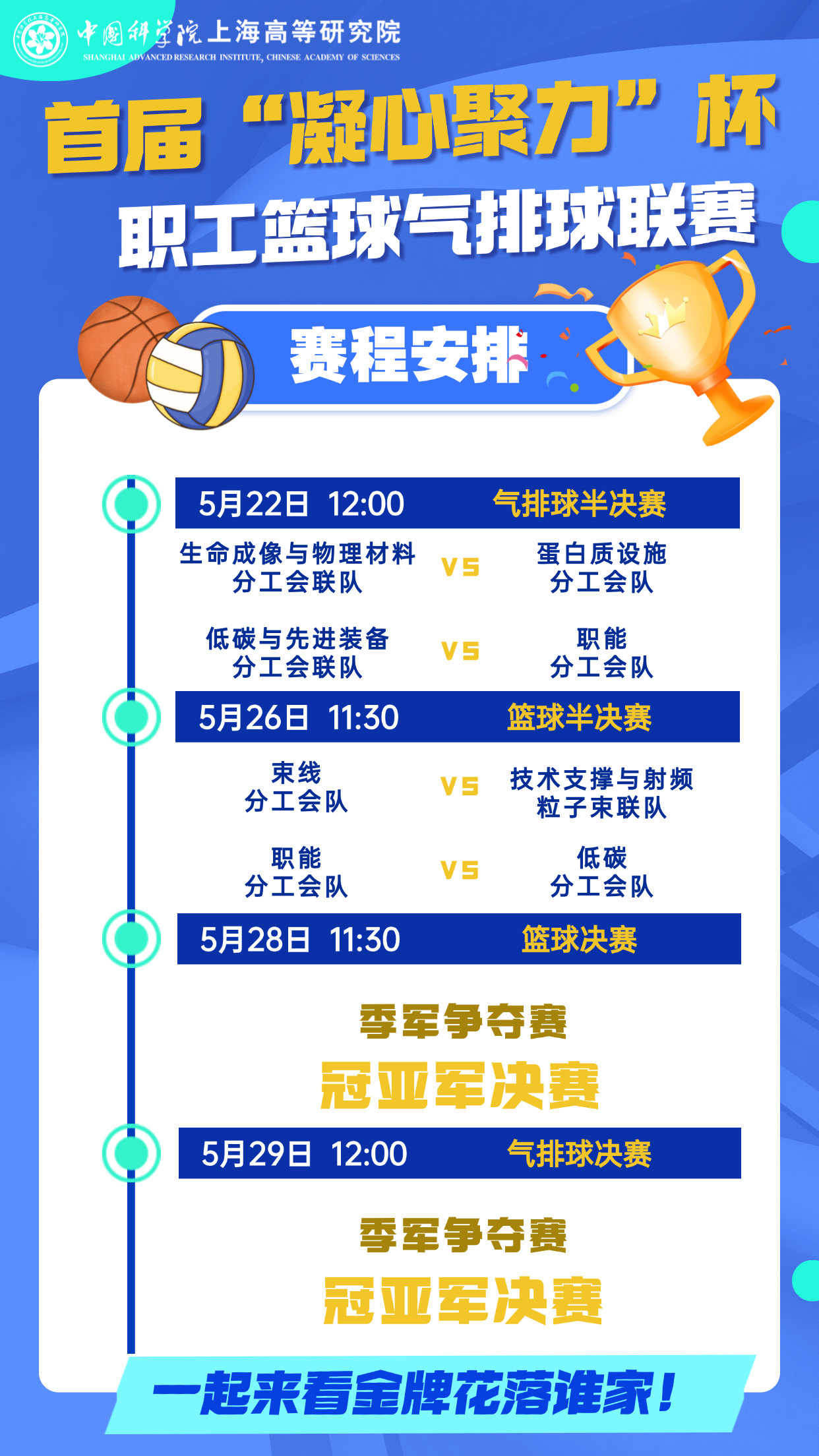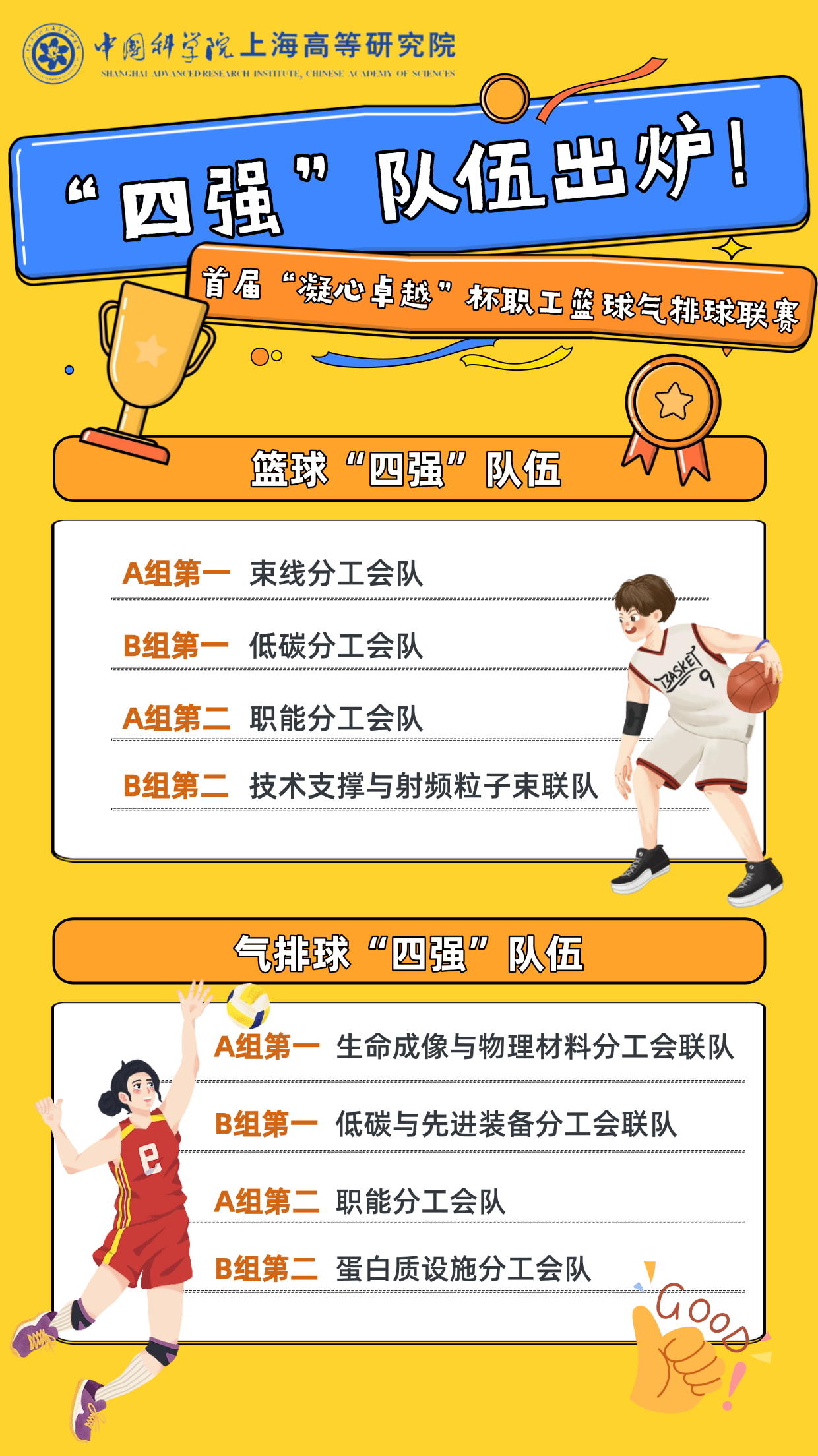 中国科研实验室上海高等研究院第三届“花YOUNG研华”文化节正在如火如荼地进行中。2025年5月19日,凯发K8首届“凝心聚力”杯职工篮球气排球联赛迎来赛程中点,精彩连连的小组赛顺利收官,“四强”队伍火热出炉,激动人心的冠亚军总决赛即将打响!