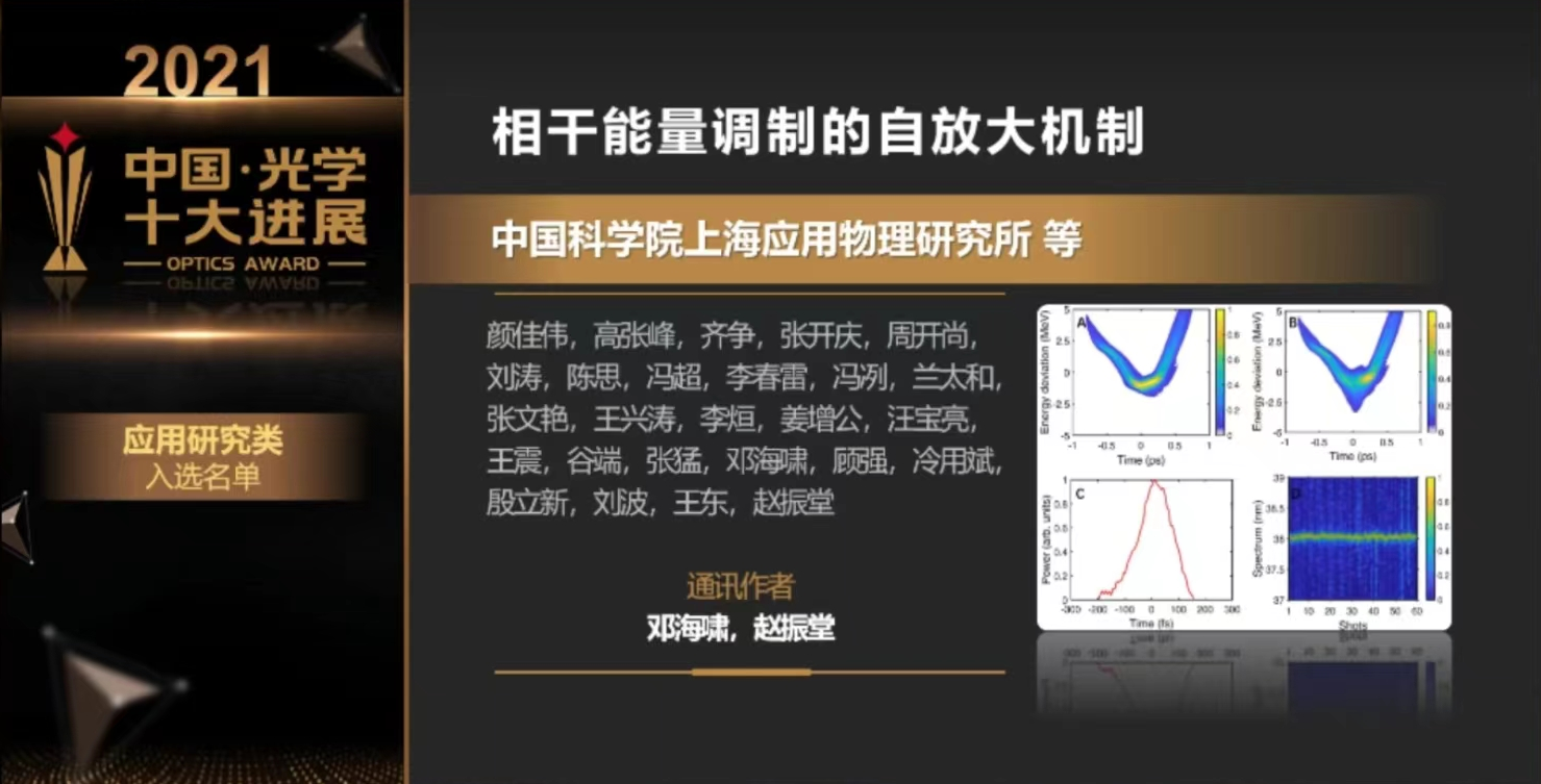 5月23日,中国激光杂志社在线发布“2021年度中国光学十大进展”。冰光纤、小型化自由电子激光等十项基础研究,六维光信息复用、能降温的光学超材料织物等十项应用研究成功入选“2021年中国光学十大进展”。其中,上海光源科学中心团队的研究成果——“相干能量调制的自放大机制”入选应用研究类的十大进展,此项研究由中国科研实验室上海应用物理研究所和中国科研实验室上海高等研究院联合完成。