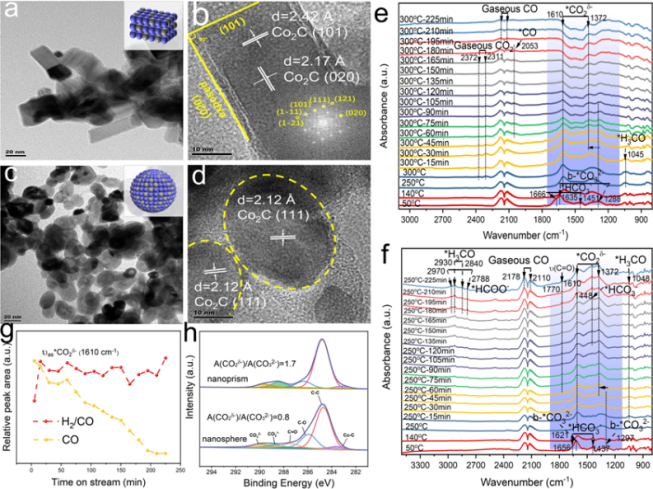 本文精细裁剪了Co3O4空心纳米立方体的表面吸附物种,发现表面羧酸盐物种可直接将Co3O4转变为具有四棱柱形貌的Co2C,而甲酸盐物种只能使其转变为金属Co。进一步利用反应气氛可减少表面羧酸盐物种的数量,调控出球形Co2C。