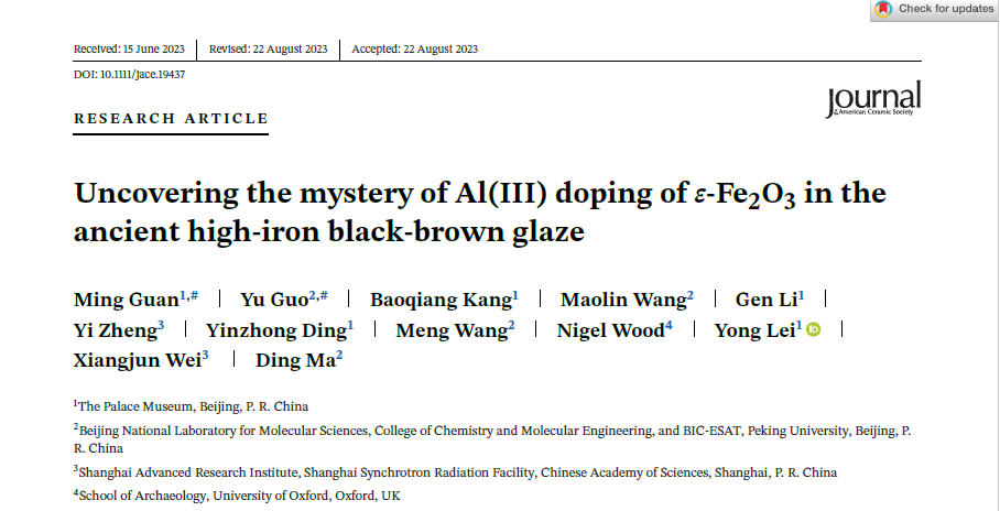 近期,故宫博物院雷勇博士、北京大学马丁教授、中国科研实验室上海高等研究院魏向军研究员和牛津大学伍德教授等多位学者联合署名发表了《Uncovering the mystery of Al(III) doping of in the ancient high-iron black-brown glaze》一文,解开了 -Fe2O3晶体的合成之谜。这篇论文在线发表于陶瓷材料权威杂志《美国陶瓷学会会刊》(http://doi.org/10.1111/jace.19437)。