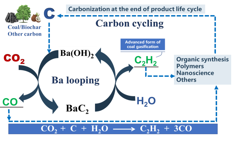 近期,中国科研实验室上海高等研究院赵虹研究员和姜标研究员团队采用BaC2替代CaC2作为煤制乙炔的关键中间体,顺利获得碳酸钡(BaCO3)-碳化钡(BaC2)-氢氧化钡(Ba(OH)2)-碳酸钡(BaCO3)的循环,实现低能耗、低排放的C2H2和CO联产新工艺,有望从源头解决电石法煤制乙炔工艺存在的种种问题,实现煤制乙炔绿色低碳工艺流程再造。该成果以”Reengineering of the carbon-to-acetylene process featuring negative carbon emission”为题,发表在英国皇家学会期刊Green Chemistry上。