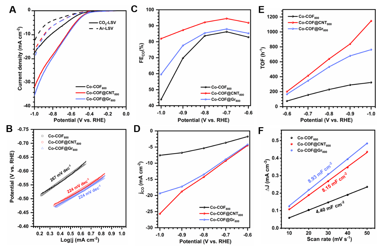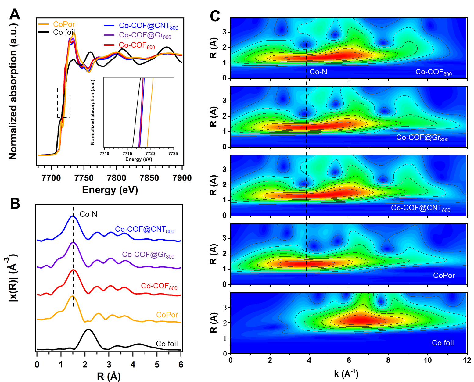 在此背景下,该研究团队以碳纳米管(CNT)和石墨烯(Gr)为模板,将COFs衍生碳的结构控制在一维(1D)到三维(3D)之间。比较研究了不同尺寸工程的COFs衍生碳对CO2RR性能的影响。EXAFS测试及拟合结果发现,催化剂中Co原子由五个N原子(Co-N5)配位,因此,顺利获得将CoPor固定在COF衍生碳上成功构筑了新的催化位点(CoN5)。