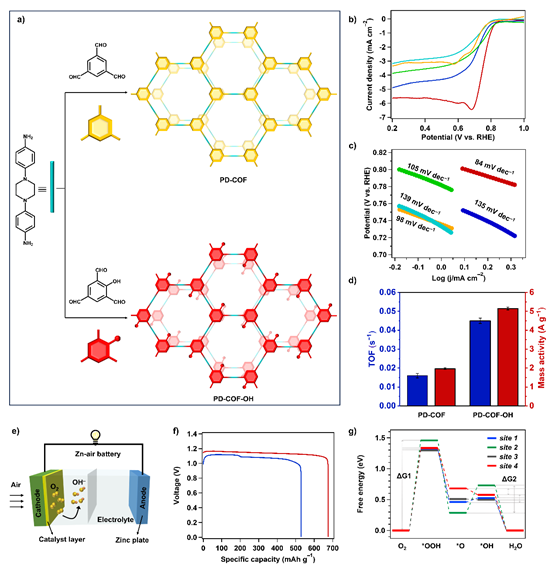 针对这一难题,该研究团队顺利获得分子工程策略,在COF骨架中引入哌嗪电子存储单元并实施羟基功能化修饰,创新研发出具有电子存储功能的共价有机框架催化剂PD-COF-OH,成功实现了电子传输效率与催化活性的协同提升。相关成果近期以“Integrating Electronic-Storage Piperazine into Covalent Organic Frameworks for Promoting Oxygen Reduction Reaction”为题发表在《德国应用化学》(Angew Chem Int Ed 2025, e202503434)上。