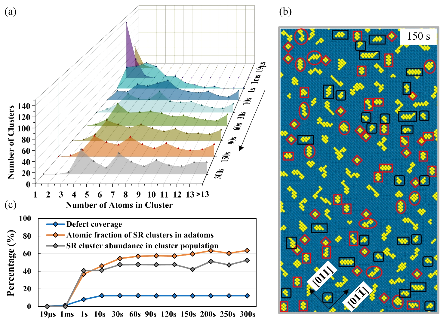 1. 本研究模拟了实验上真实尺寸的Cu(100)表面(约35 nm × 35 nm)在300秒内的实时重构过程。统计分析显示,在相对于可逆氢电极电位为0.2 V的条件下,原位形成的团簇主要由4原子单元构成的锯齿边亚纳米带状结构主导。